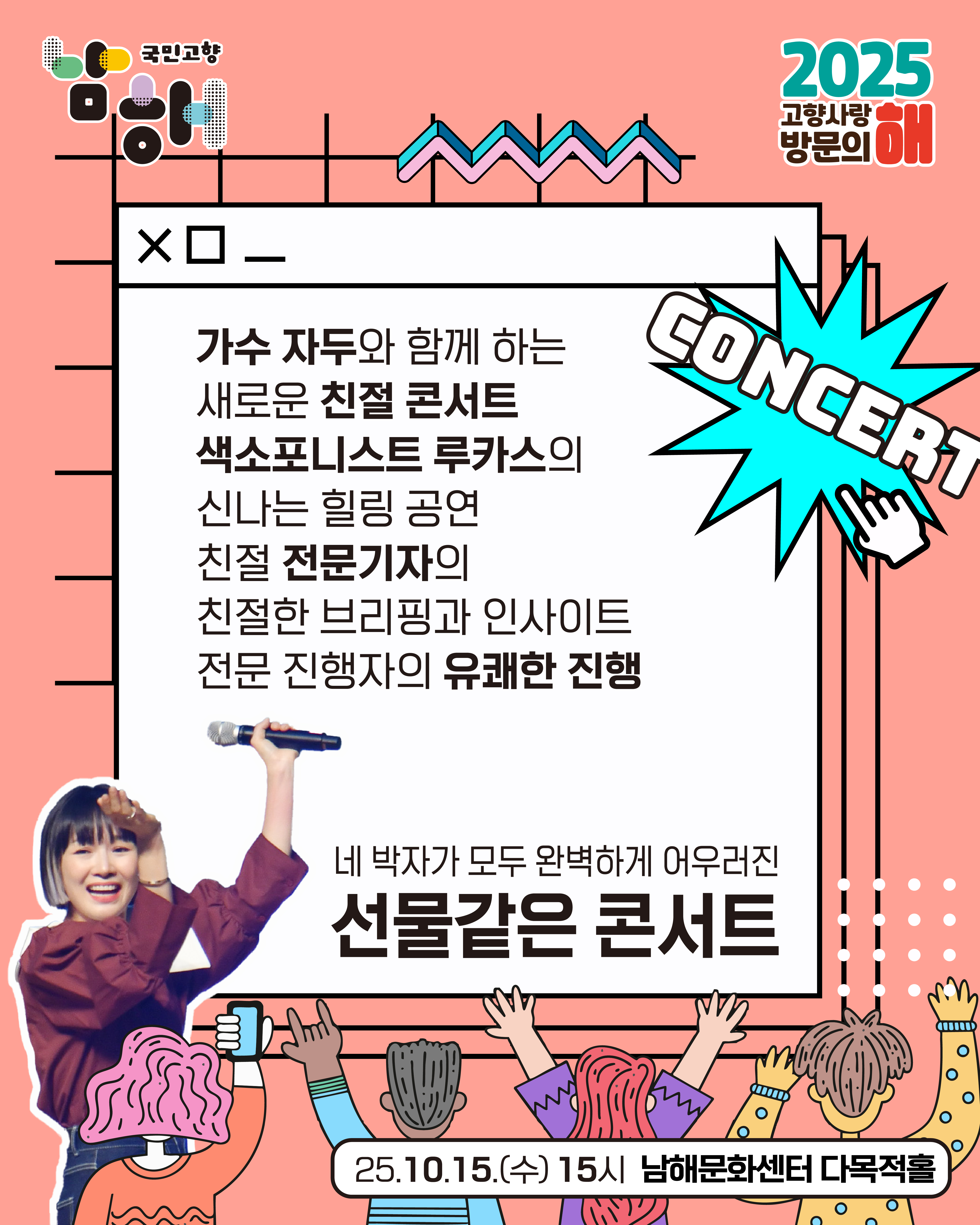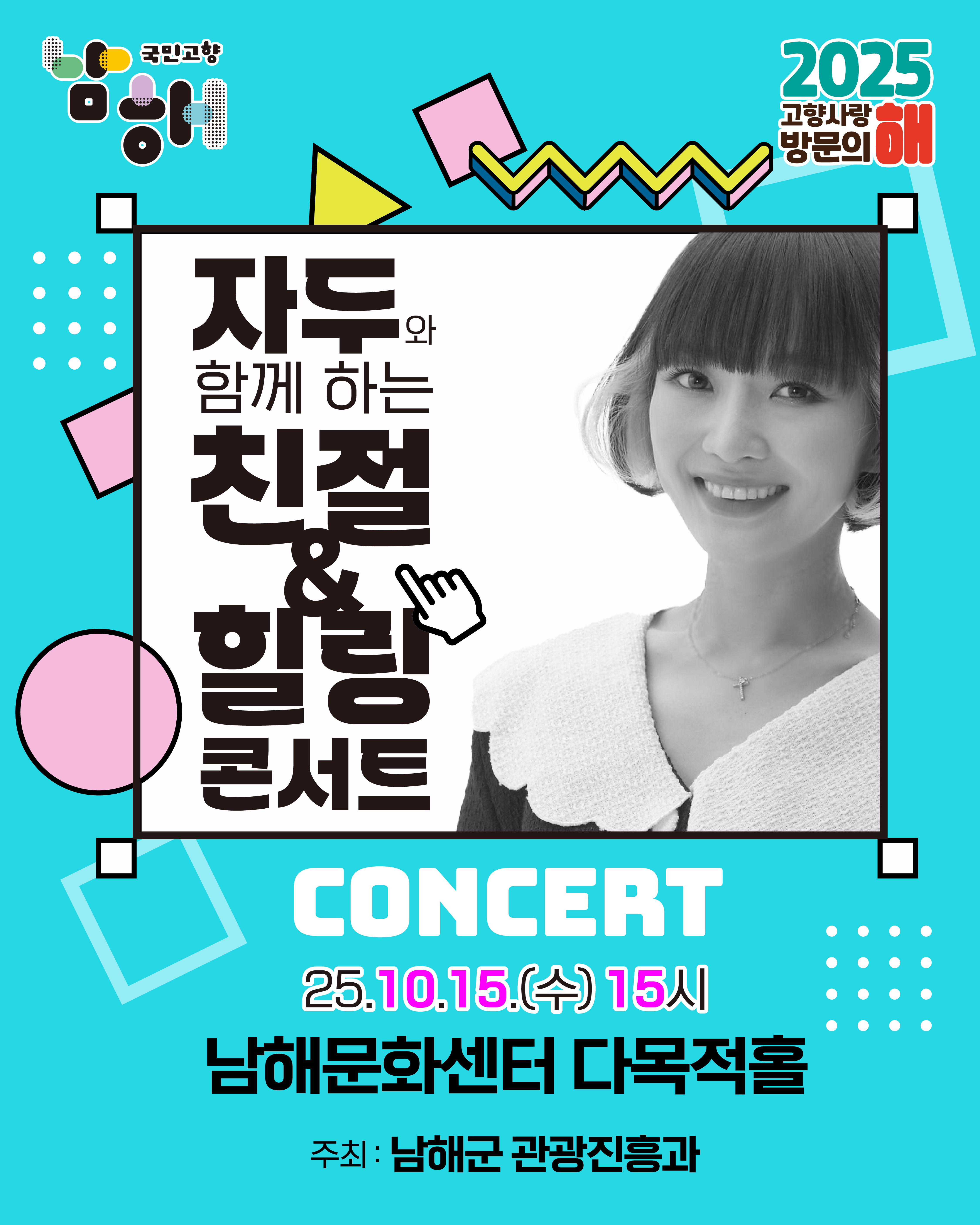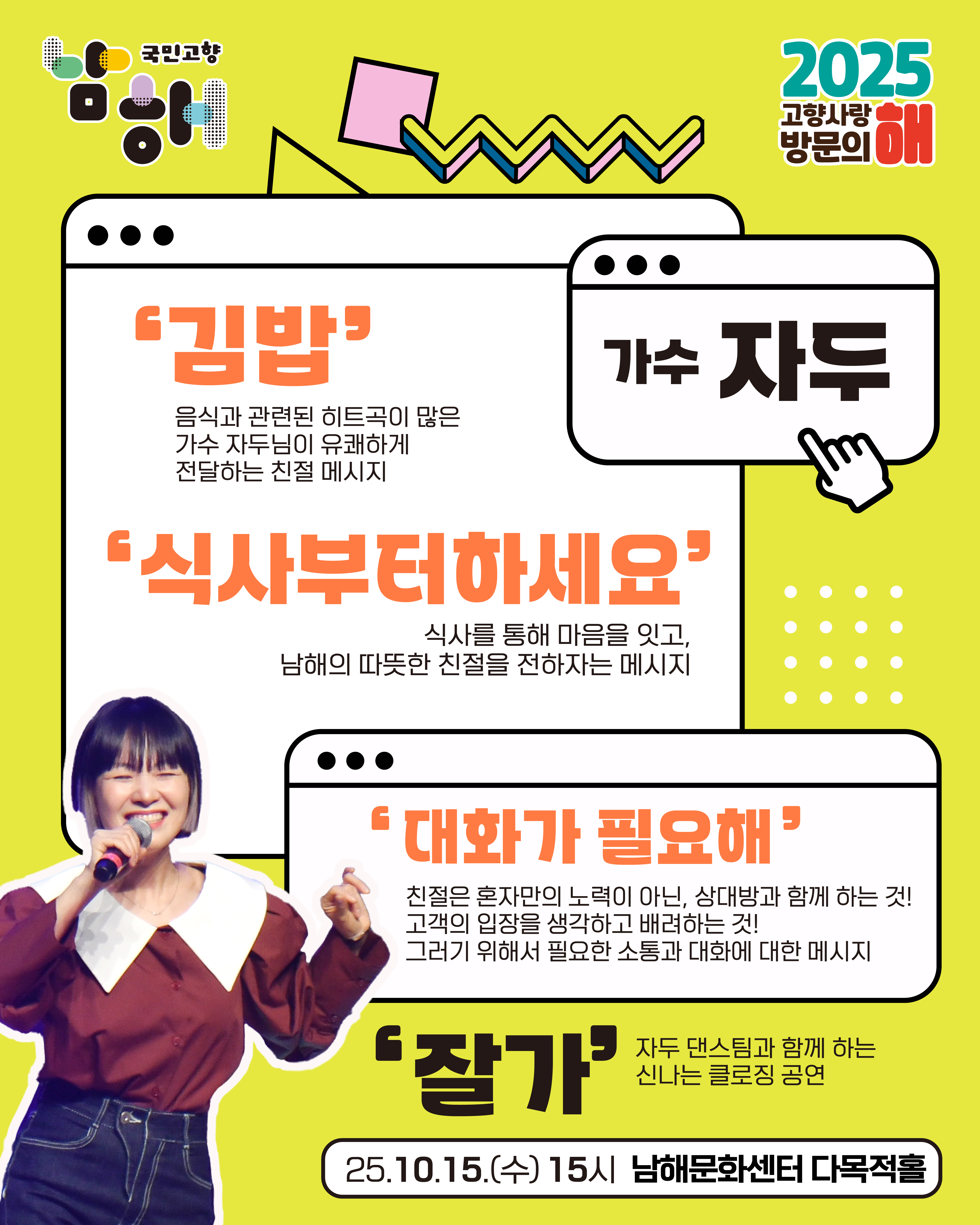 가을 바람이 선선하게 불어오는 10월, 남해에 따뜻한 목소리와 친절한 음악이 찾아옵니다. 마음이 말랑해지는 목소리, 유쾌한 입담으로 많은 사랑을 받아온 가수 자두가 남해군민들을 위한 힐링의 시간을 선사합니다. 그녀의 노래에는 늘 소박한 진심이 담겨 있죠. ‘김밥’, ‘잘가’, ‘식사부터 하세요’ 등 일상과 마음을 이어주는 이야기로 가득한 무대는 남해의 가을 오후를 한층 더 포근하게 만들어줄 거예요.