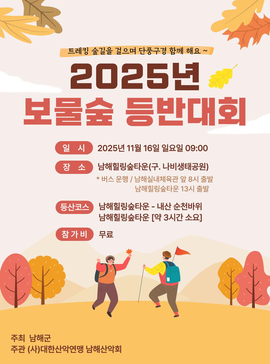 찬바람이 불기 시작하는 11월, 남해의 숲이 황금빛으로 물듭니다. 그리고 그 숲길 위를 천천히, 함께 걷는 사람들이 있습니다. 오는 11월 16일(일) 오전 9시, 남해힐링숲타운(구. 나비생태공원)에서 ‘2025년 보물숲 등반대회’가 열립니다. 남해군이 주최하고 (사)대한산악연맹 남해산악회가 주관하는 이번 대회는, 남해의 아름다운 숲길을 걸으며 가을의 끝자락을 온전히 느낄 수 있는 트레킹 행사입니다.