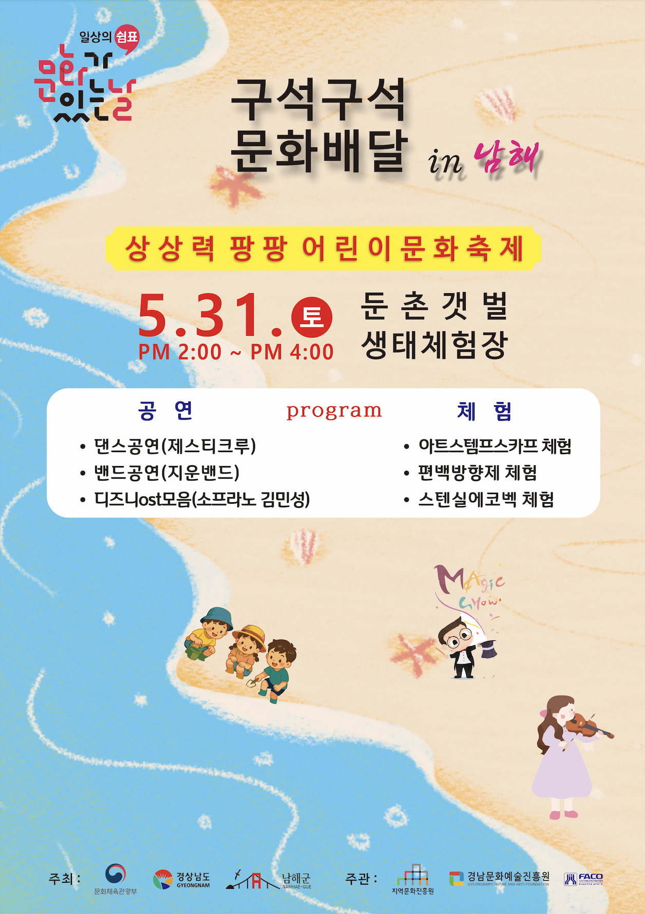 2025년 구석구석 문화배달 사업 5월 행사 개최내용을 다음과 같이 알려드리니 많은 관심 바랍니다.
